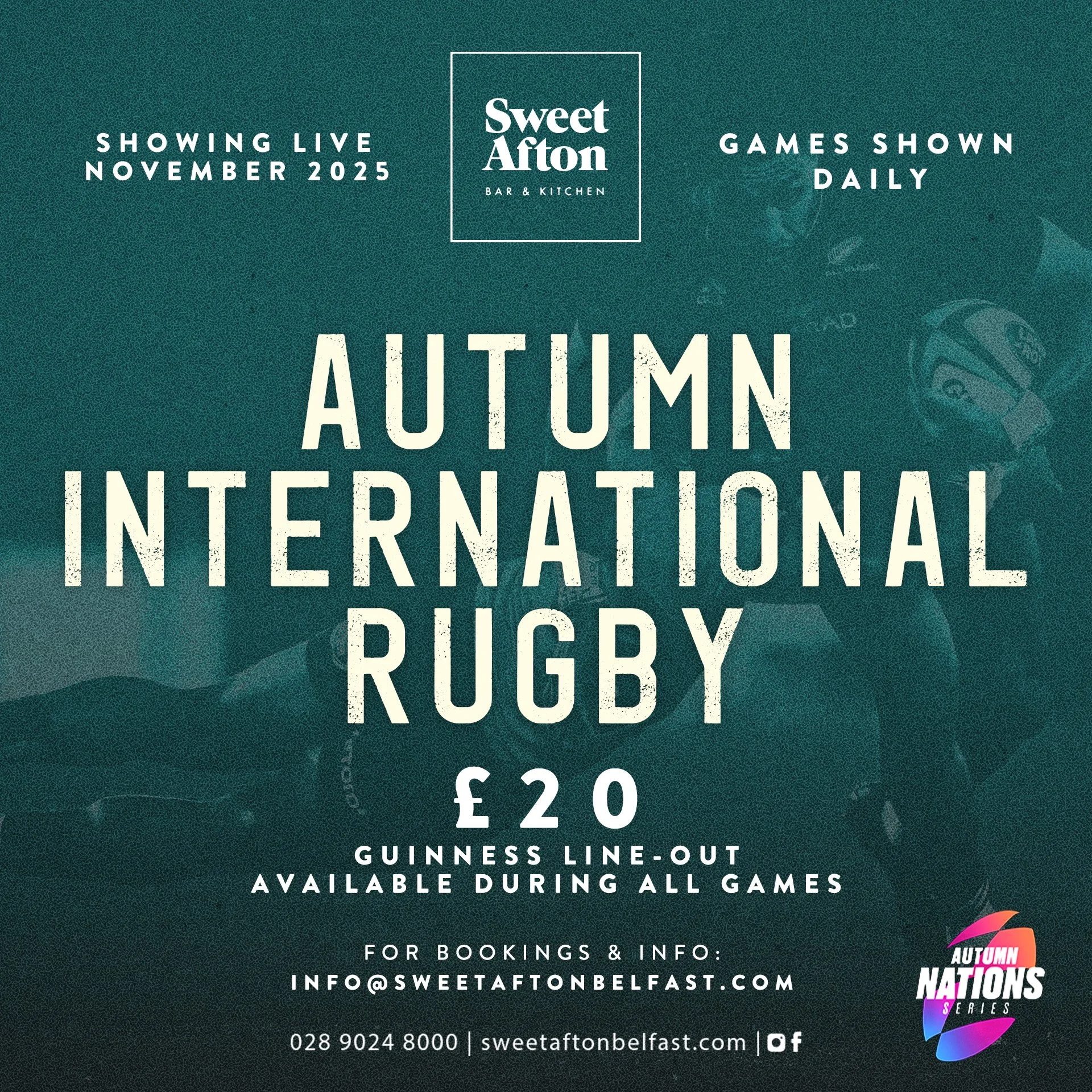 Enjoy a burger and a pint for just £15 in Sweet Afton during all Ulster Rugby matches.